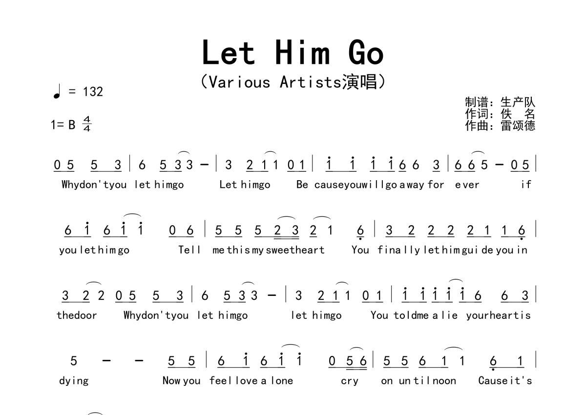 《Let Him Go》是Various Artists演唱的一首歌曲,拍号为4/4拍,歌曲速度为每分钟132拍,这份简谱共有两张高清图谱,图谱由 @生产队 编配上传。