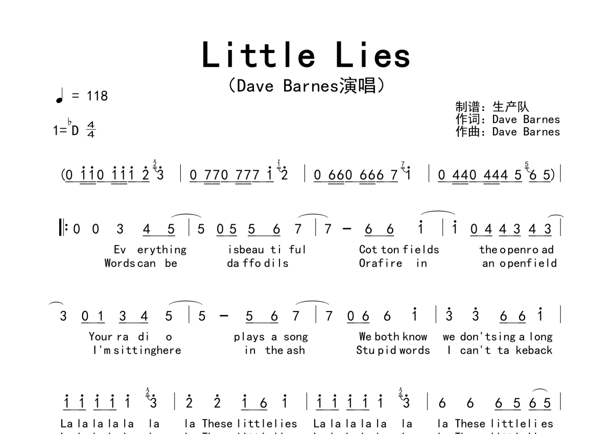 《Little Lies》是Dave Barnes演唱的一首歌曲,拍号为4/4拍,歌曲速度为每分钟118拍,这份简谱共有两张高清图谱,图谱由 @生产队 编配上传。