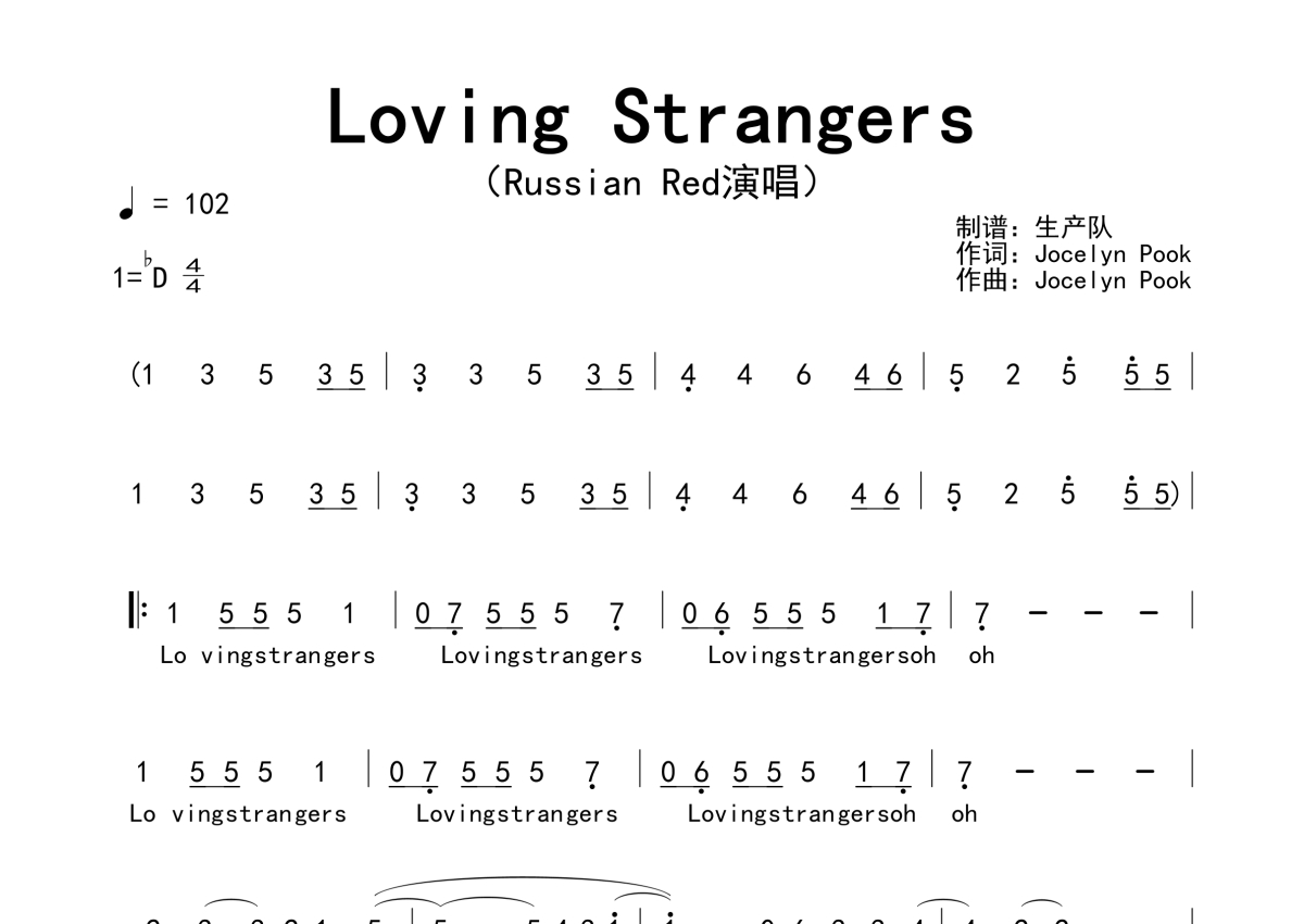 《Loving Strangers》是Russian Red演唱的一首歌曲,拍号为4/4拍,歌曲速度为每分钟102拍,这份简谱共有两张高清图谱,图谱由 @生产队 编配上传。