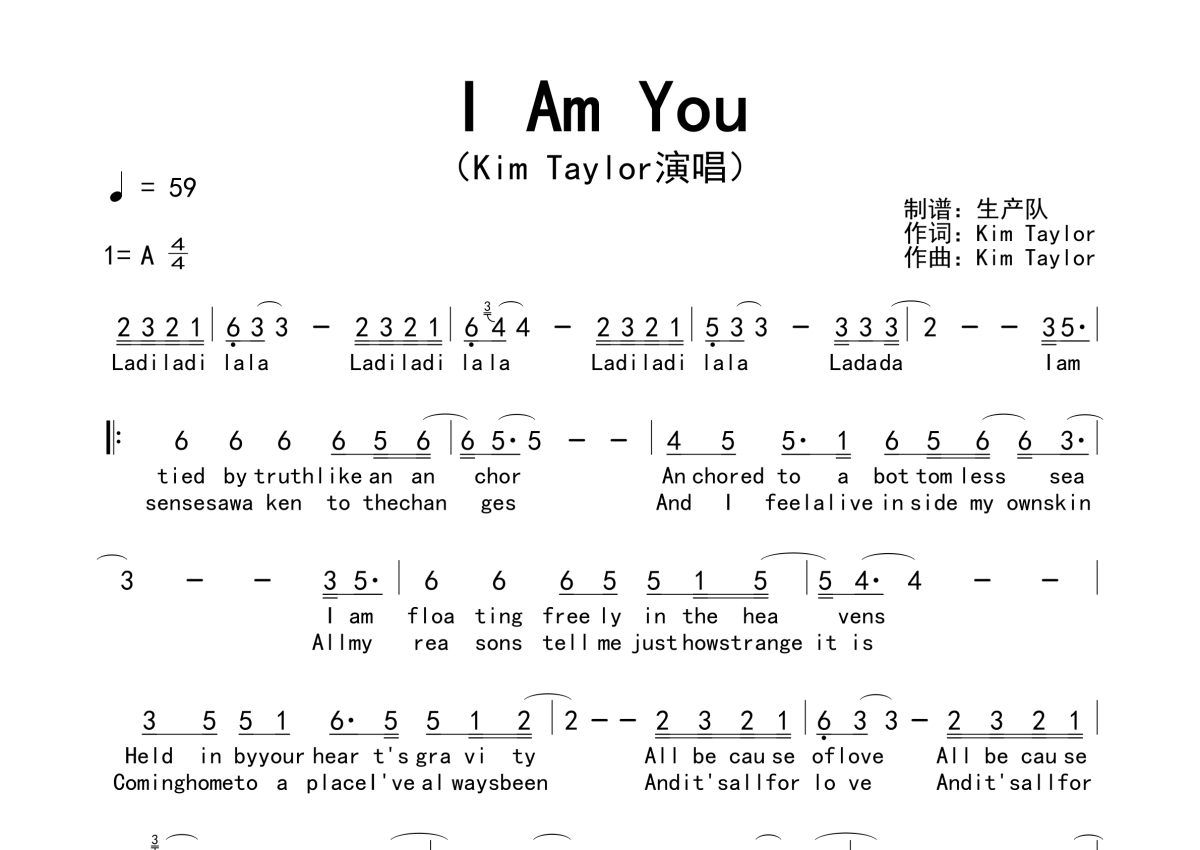《I Am You》是Kim Taylor演唱的一首歌曲,拍号为4/4拍,歌曲速度为每分钟59拍,这份简谱共有一张高清图谱,图谱由 @生产队 编配上传。