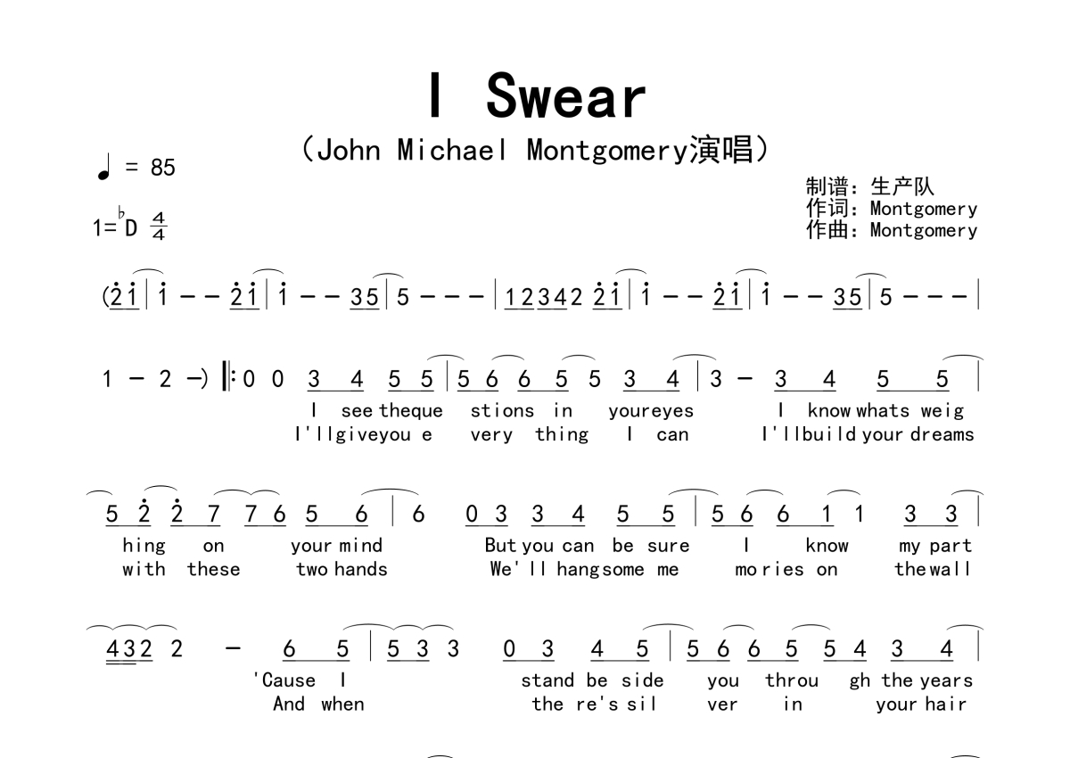 《I Swear》是John Michael Montgomery演唱的一首歌曲,拍号为4/4拍,歌曲速度为每分钟85拍,这份简谱共有一张高清图谱,图谱由 @生产队 编配上传。