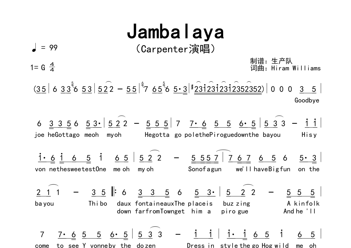 《Jambalaya》是Carpenters演唱的一首歌曲,拍号为4/4拍,歌曲速度为每分钟99拍,这份简谱共有一张高清图谱,图谱由 @生产队 编配上传。