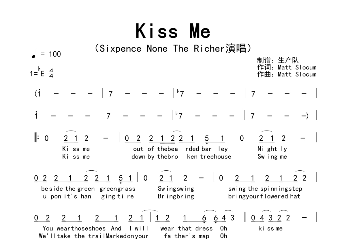 《Kiss Me》是Sixpence None the Richer演唱的一首歌曲,拍号为4/4拍,歌曲速度为每分钟100拍,这份简谱共有一张高清图谱,图谱由 @生产队 编配上传。