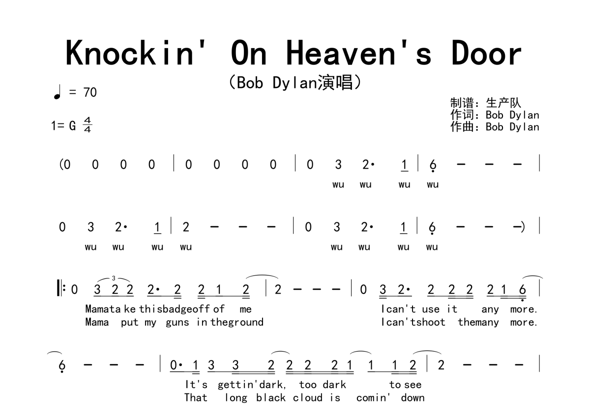 《Knockin' On Heaven's Door》是Bob Dylan演唱的一首歌曲,拍号为4/4拍,歌曲速度为每分钟70拍,这份简谱共有一张高清图谱,图谱由 @生产队 编配上传。
