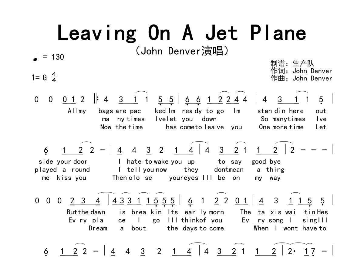 《Leaving On A Jet Plane》是John Denver演唱的一首歌曲,拍号为4/4拍,歌曲速度为每分钟130拍,这份简谱共有一张高清图谱,图谱由 @生产队 编配上传。