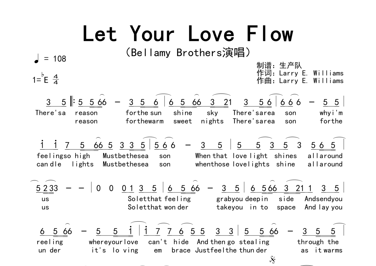 《Let Your Love Flow》是Bellamy Brothers演唱的一首歌曲,拍号为4/4拍,歌曲速度为每分钟108拍,这份简谱共有一张高清图谱,图谱由 @生产队 编配上传。