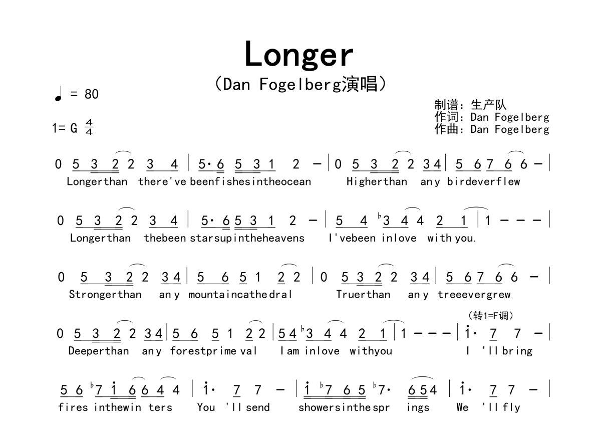 《Longer》是Dan Fogelberg演唱的一首歌曲,拍号为4/4拍,歌曲速度为每分钟80拍,这份简谱共有一张高清图谱,图谱由 @生产队 编配上传。
