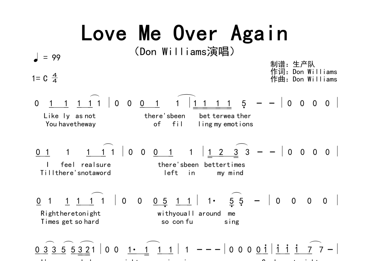 《Love Me Over Again》是Don Williams演唱的一首歌曲,拍号为4/4拍,歌曲速度为每分钟99拍,这份简谱共有一张高清图谱,图谱由 @生产队 编配上传。