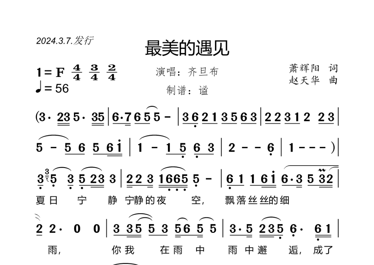 《最美的遇见》是齐旦布演唱的一首歌曲,拍号为4/4拍,歌曲速度为每分钟56拍,这份简谱共有两张高清图谱,图谱由 @谧 编配上传齐旦布《最美的遇见》,原唱版本,2024.3.7.发行,F调,4/4、3/4、2/4拍,速度56,谧精心制谱,大字版,共2页。