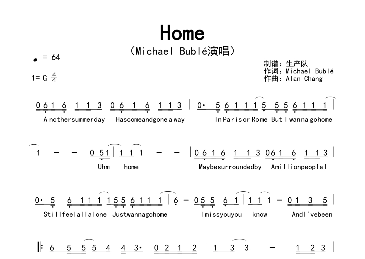 《Home》是Michael Bublé演唱的一首歌曲,拍号为4/4拍,歌曲速度为每分钟64拍,这份简谱共有两张高清图谱,图谱由 @生产队 编配上传。