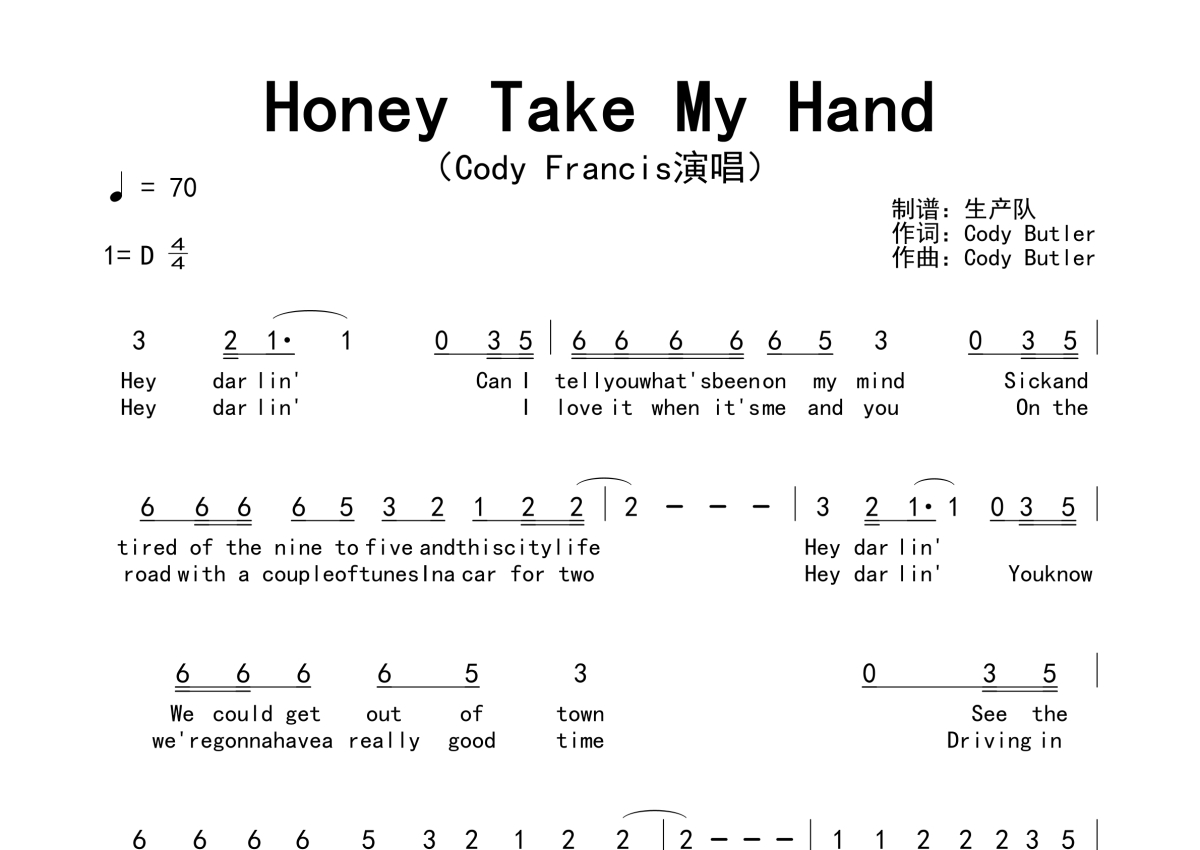 《Honey Take My Hand》是Cody Francis演唱的一首歌曲,拍号为4/4拍,歌曲速度为每分钟70拍,这份简谱共有两张高清图谱,图谱由 @生产队 编配上传。