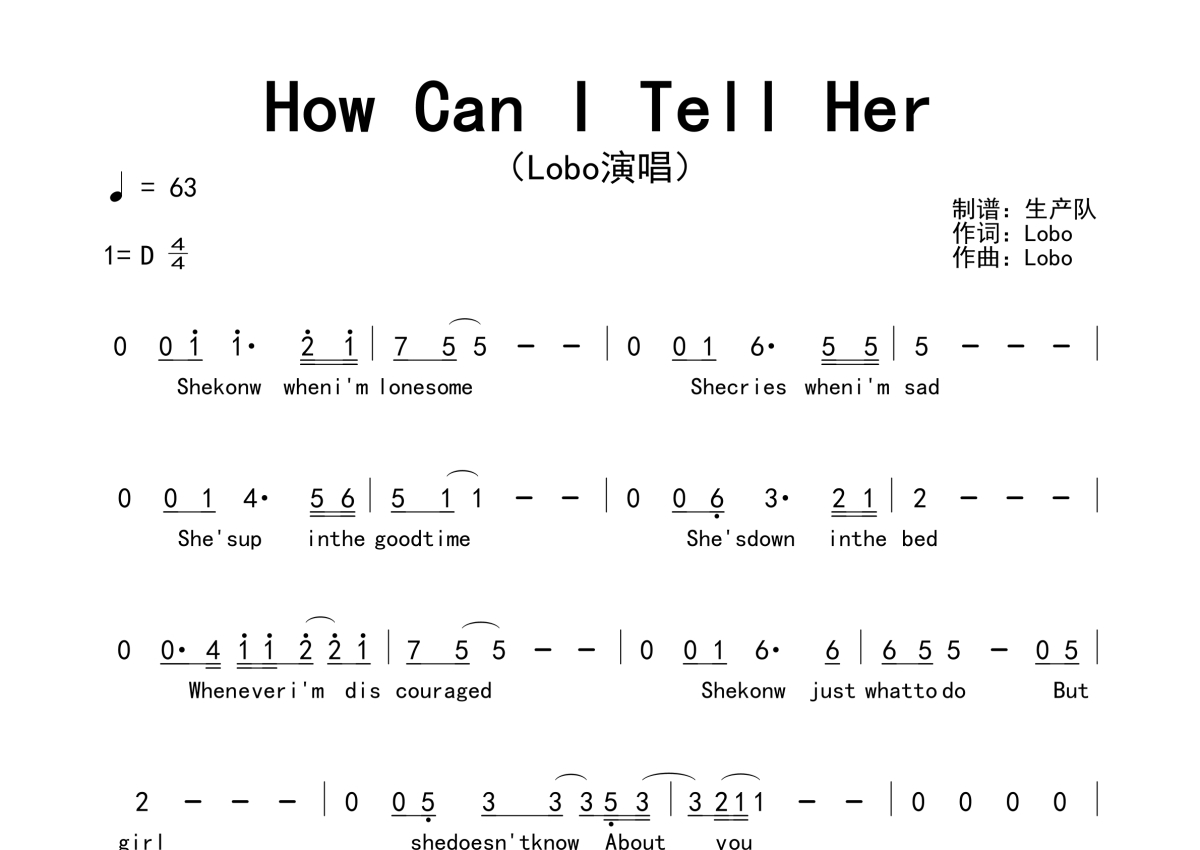 《How Can I Tell Her》是Lobo演唱的一首歌曲,拍号为4/4拍,歌曲速度为每分钟63拍,这份简谱共有两张高清图谱,图谱由 @生产队 编配上传。