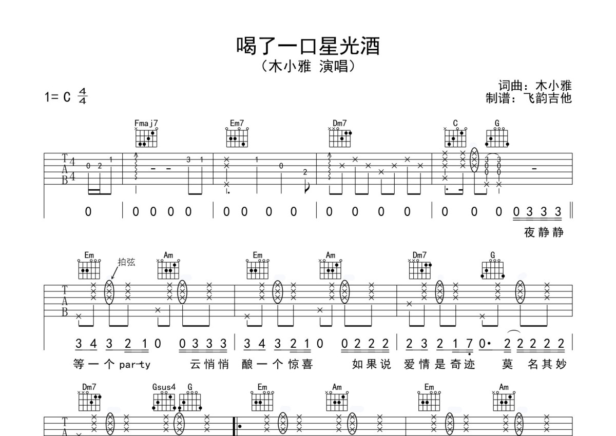 木小雅《喝了一口星光酒》吉他谱 - C调弹唱六线谱