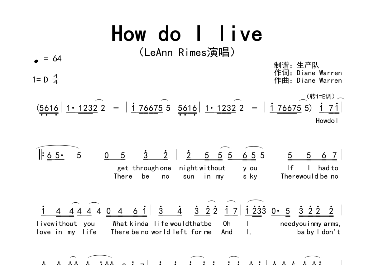 《How do I live》是LeAnn Rimes演唱的一首歌曲,拍号为4/4拍,歌曲速度为每分钟64拍,这份简谱共有两张高清图谱,图谱由 @生产队 编配上传。