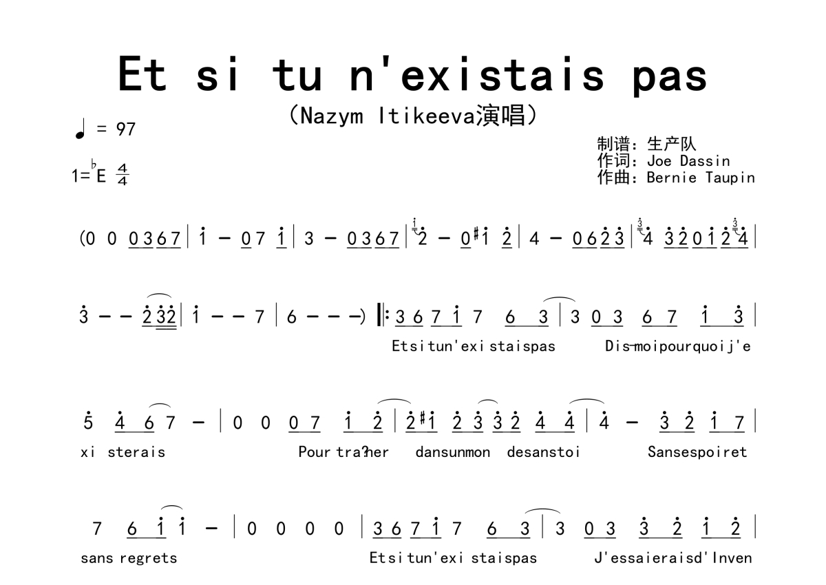 《Et si tu n'existais pas》是Nazym Itikeeva演唱的一首歌曲,拍号为4/4拍,歌曲速度为每分钟97拍,这份简谱共有一张高清图谱,图谱由 @生产队 编配上传。