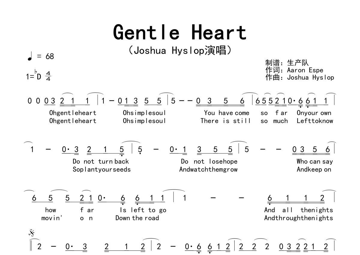 《Gentle Heart》是Joshua Hyslop演唱的一首歌曲,拍号为4/4拍,歌曲速度为每分钟68拍,这份简谱共有一张高清图谱,图谱由 @生产队 编配上传。