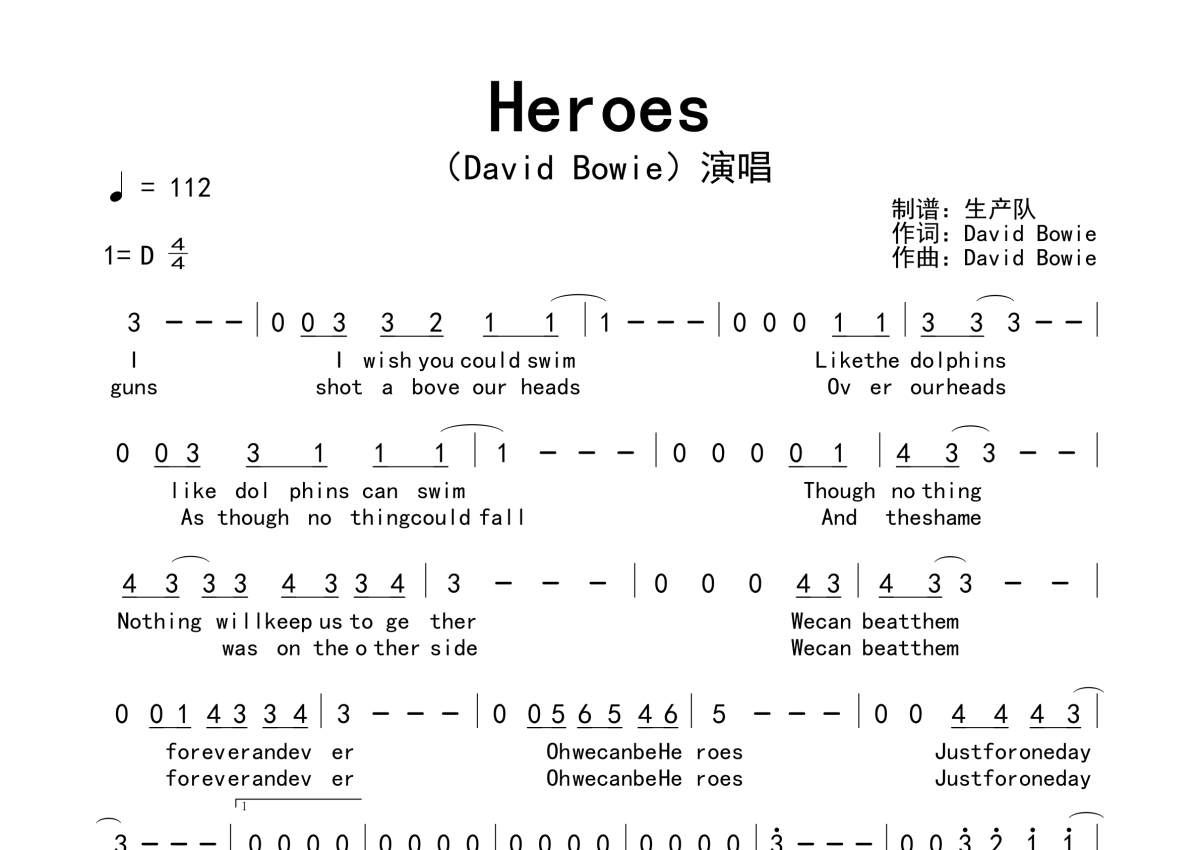 《Heroes》是David Bowie演唱的一首歌曲,拍号为4/4拍,歌曲速度为每分钟112拍,这份简谱共有一张高清图谱,图谱由 @生产队 编配上传。