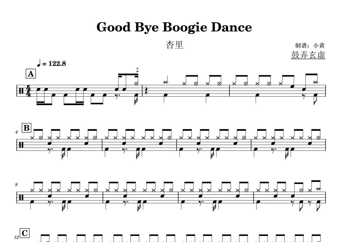 《Good Bye Boogie Dance》是杏里演唱的一首歌曲,歌曲速度为每分钟123拍,这份架子鼓谱共有四张高清图谱,图谱由 @小黄 编配上传,图谱使用五线谱编配,使用这份Good Bye Boogie Dance架子鼓谱,你将能够轻松地敲打出这首杏里的Good Bye Boogie Dance,快来尝试吧。