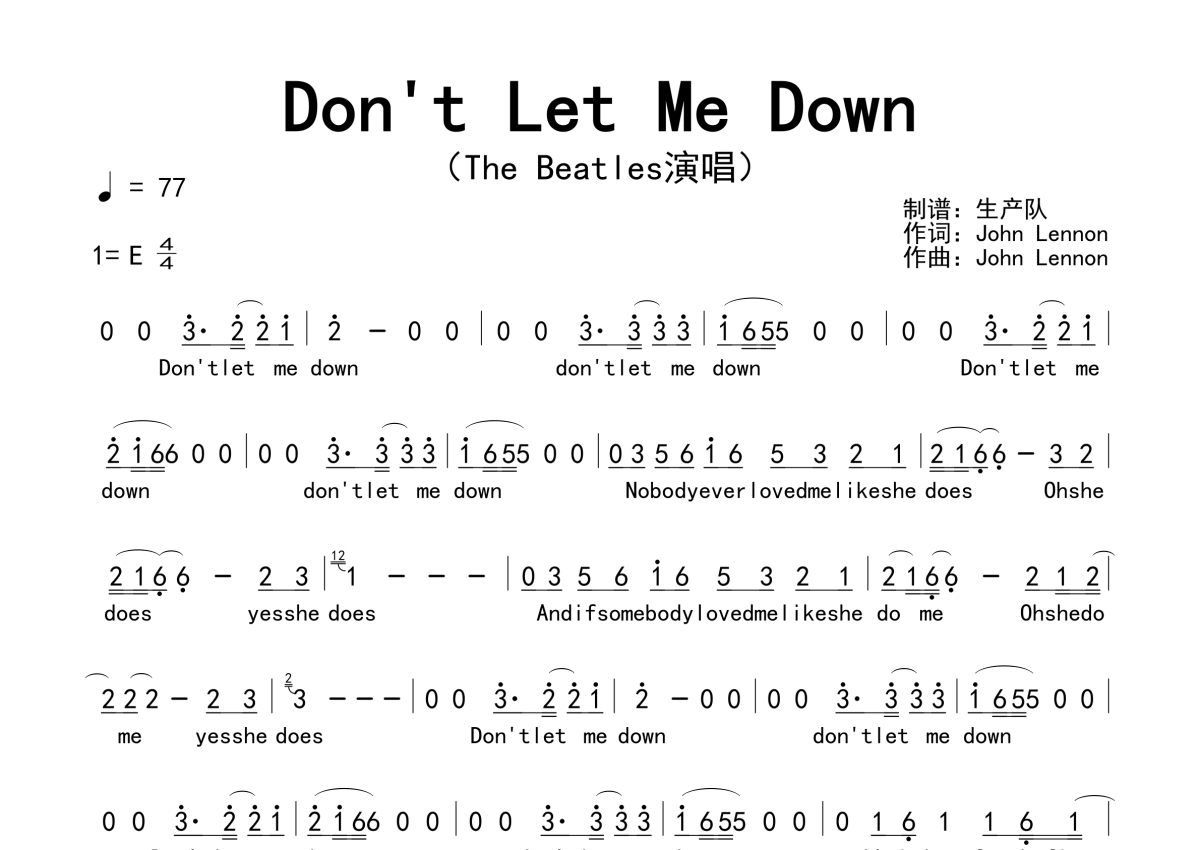 《Don't Let Me Down》是The Beatles演唱的一首歌曲,拍号为4/4拍,歌曲速度为每分钟77拍,这份简谱共有一张高清图谱,图谱由 @生产队 编配上传。