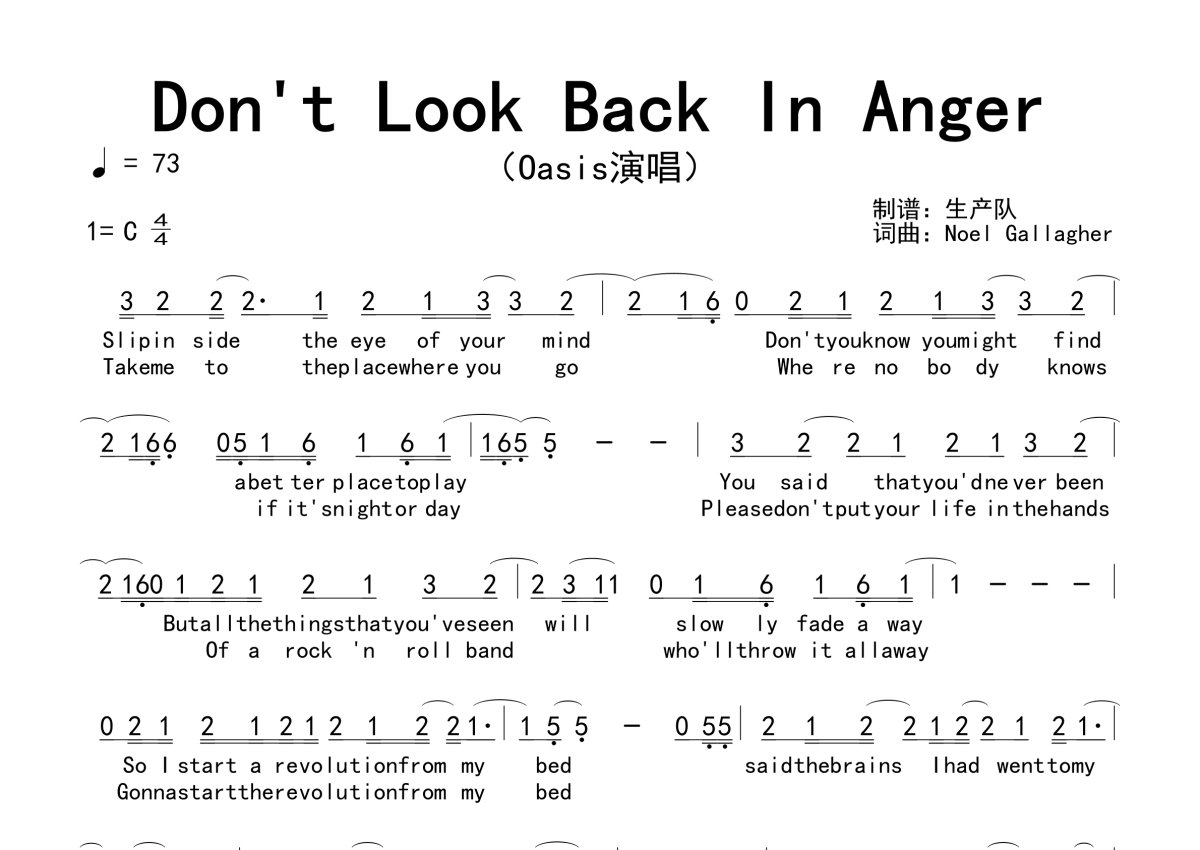 《Don't Look Back In Anger》是Oasis演唱的一首歌曲,拍号为4/4拍,歌曲速度为每分钟73拍,这份简谱共有一张高清图谱,图谱由 @生产队 编配上传。