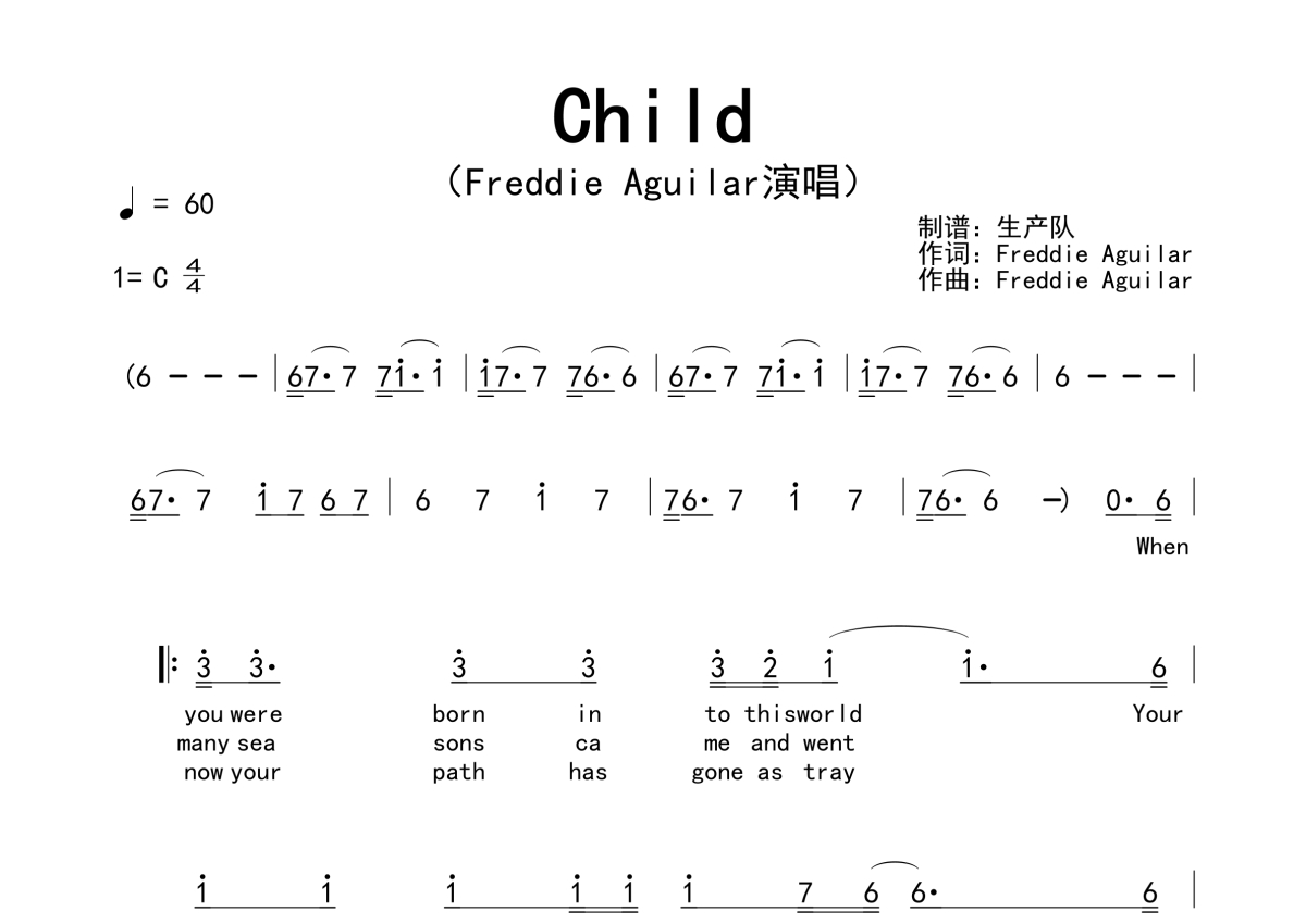 《Child》是Freddie Aguilar演唱的一首歌曲,拍号为4/4拍,歌曲速度为每分钟60拍,这份简谱共有两张高清图谱,图谱由 @生产队 编配上传。
