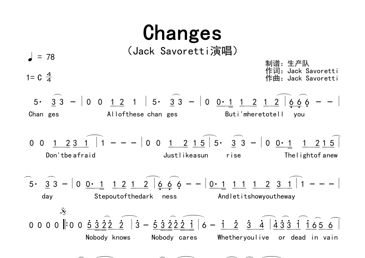 《Changes》是Jack Savoretti演唱的一首歌曲,拍号为4/4拍,歌曲速度为每分钟78拍,这份简谱共有一张高清图谱,图谱由 @生产队 编配上传。