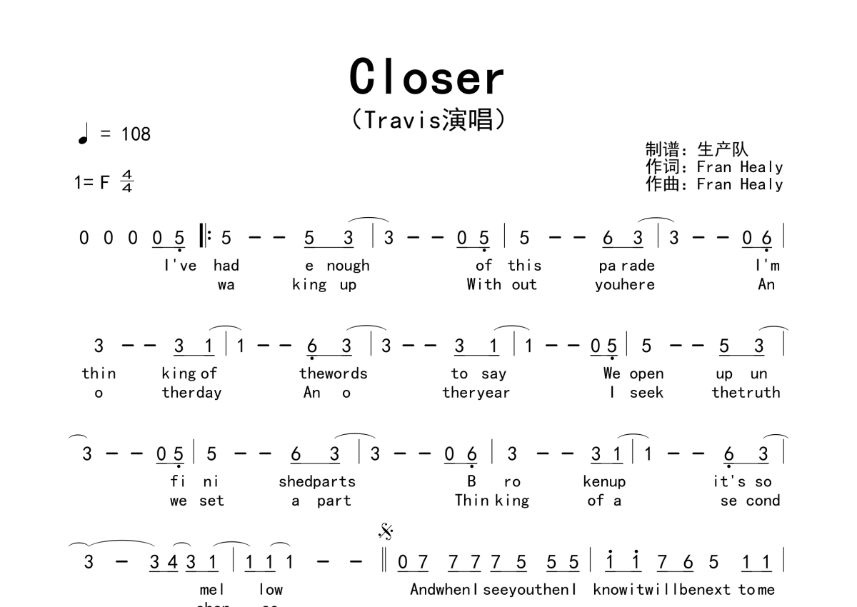 《Closer》是Travis演唱的一首歌曲,拍号为4/4拍,歌曲速度为每分钟108拍,这份简谱共有一张高清图谱,图谱由 @生产队 编配上传。