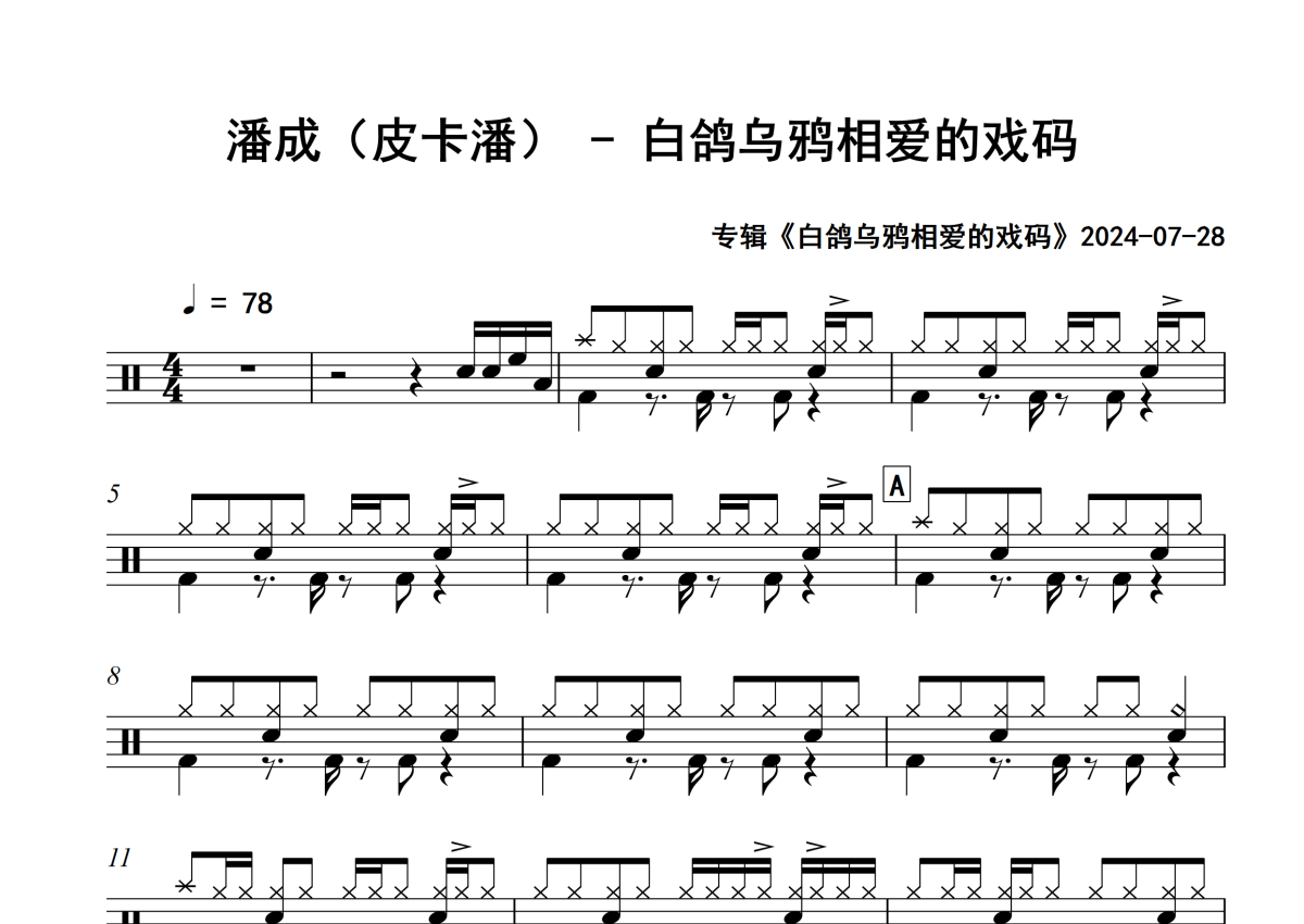 《白鸽乌鸦相爱的戏码》是潘成(皮卡潘)演唱的一首歌曲,拍号为4/4拍,歌曲速度为每分钟78拍,这份架子鼓谱共有两张高清图谱,图谱由 @Sawubona 编配上传,图谱使用五线谱编配,使用这份白鸽乌鸦相爱的戏码架子鼓谱,你将能够轻松地敲打出这首潘成(皮卡潘)的白鸽乌鸦相爱的戏码,快来尝试吧。