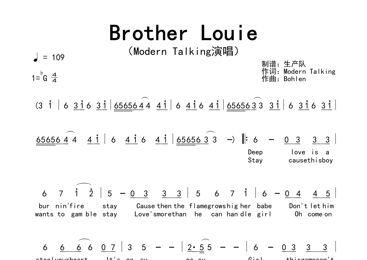 《Brother Louie》是Modern Talking演唱的一首歌曲,拍号为4/4拍,歌曲速度为每分钟109拍,这份简谱共有两张高清图谱,图谱由 @生产队 编配上传。