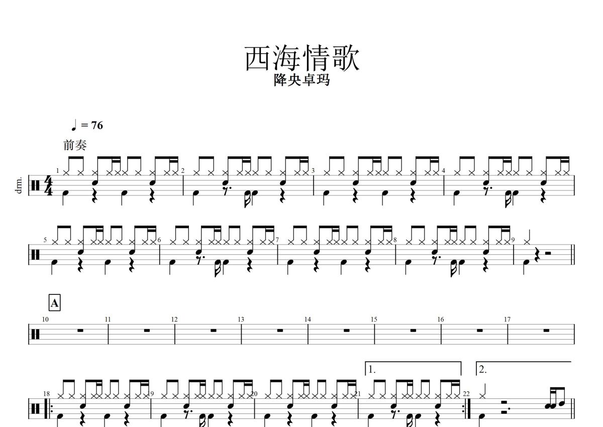 降央卓玛《西海情歌》鼓谱 - 架子鼓谱