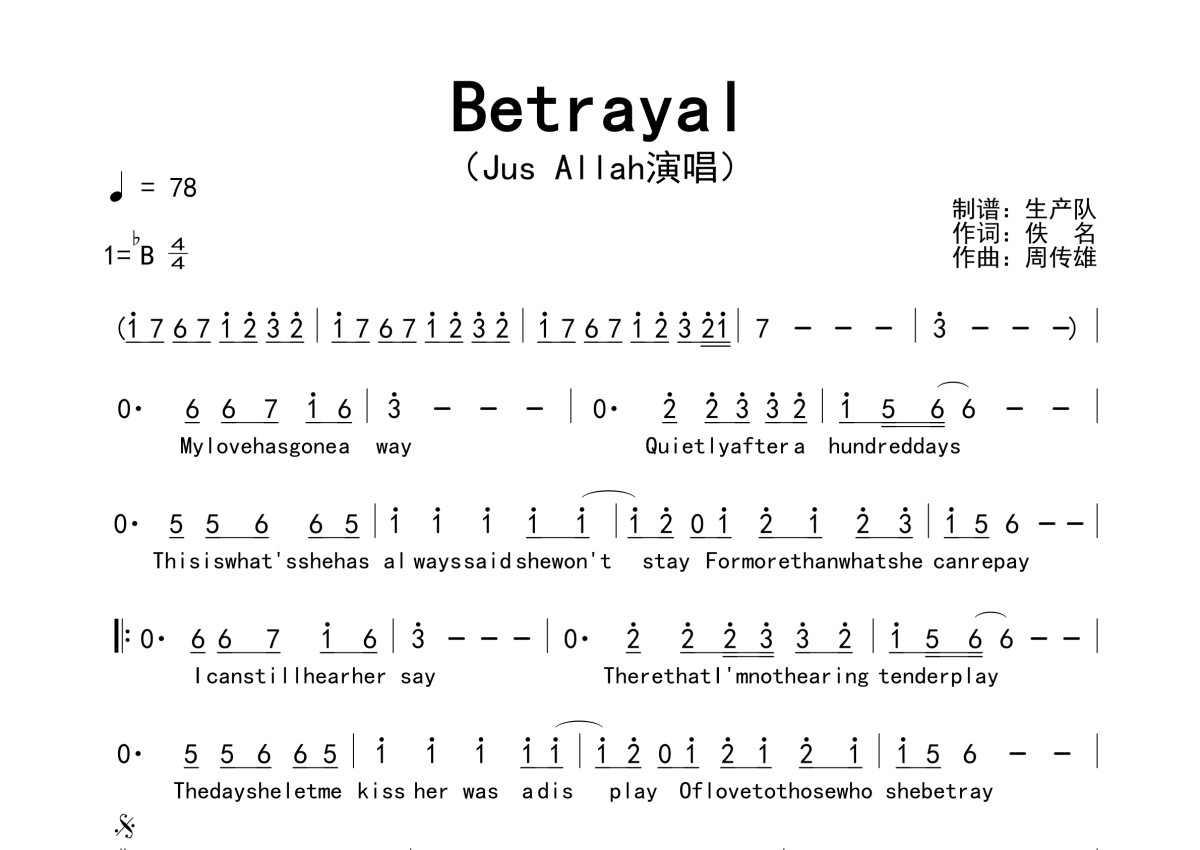 《Betrayal》是Jus Allah演唱的一首歌曲,拍号为4/4拍,歌曲速度为每分钟78拍,这份简谱共有一张高清图谱,图谱由 @生产队 编配上传。