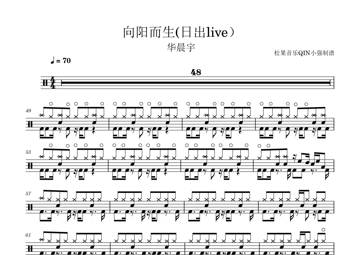 《向阳而生(日出live)》是日出live演唱的一首歌曲,拍号为4/4拍,这份架子鼓谱共有六张高清图谱,图谱由 @松果音乐QIN小强 编配上传,图谱使用五线谱编配,使用这份向阳而生(日出live)架子鼓谱,你将能够轻松地敲打出这首日出live的向阳而生(日出live),快来尝试吧。《向阳而生》是华晨宇演唱的一首歌曲,收录于2022年12月20日发行的专辑《希忘Hope》中。 2023年2月22日,由歌手华晨宇治愈演唱的《向阳而生》MV正式发布。此版本为日出演唱会现场版。