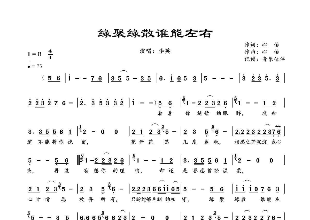 《缘聚缘散谁能左右》是李英演唱的一首歌曲,拍号为4/4拍,歌曲速度为每分钟75拍,这份简谱共有一张高清图谱,图谱由 @音乐伙伴 编配上传。