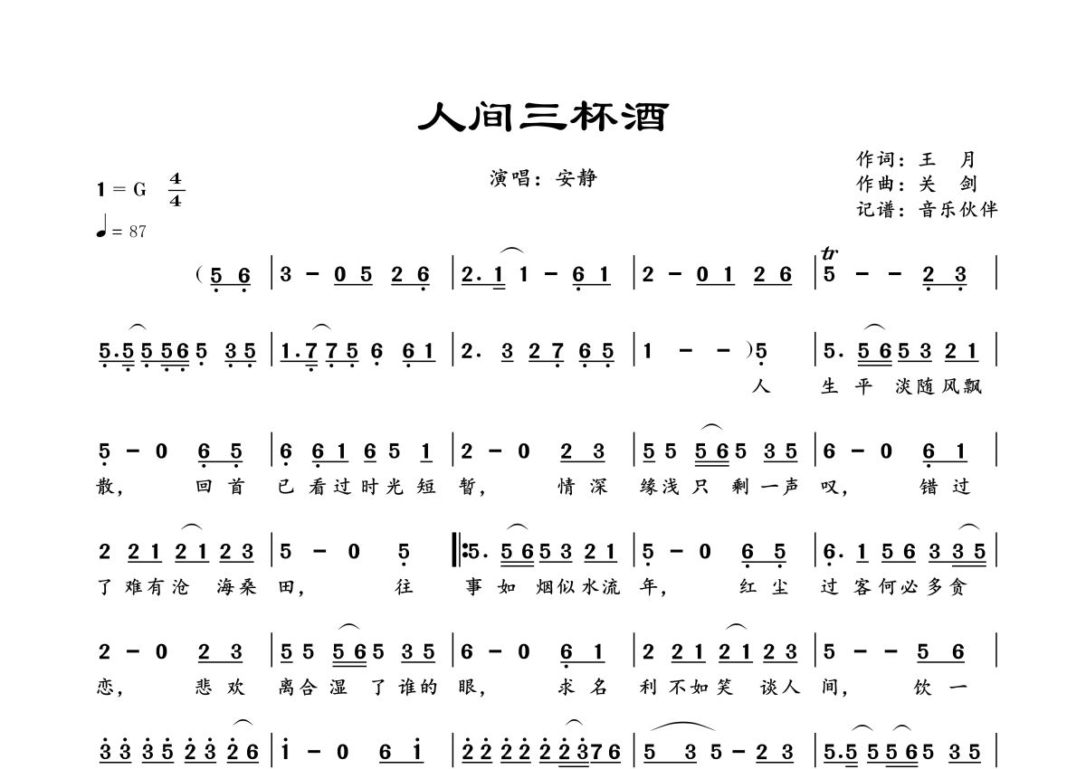 《人间三杯酒》是安静演唱的一首歌曲,拍号为4/4拍,歌曲速度为每分钟87拍,这份简谱共有一张高清图谱,图谱由 @音乐伙伴 编配上传。
