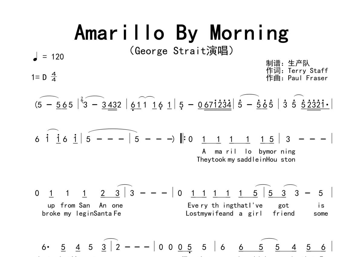 《Amarillo By Morning》是George Strait演唱的一首歌曲,拍号为4/4拍,歌曲速度为每分钟120拍,这份简谱共有两张高清图谱,图谱由 @生产队 编配上传。