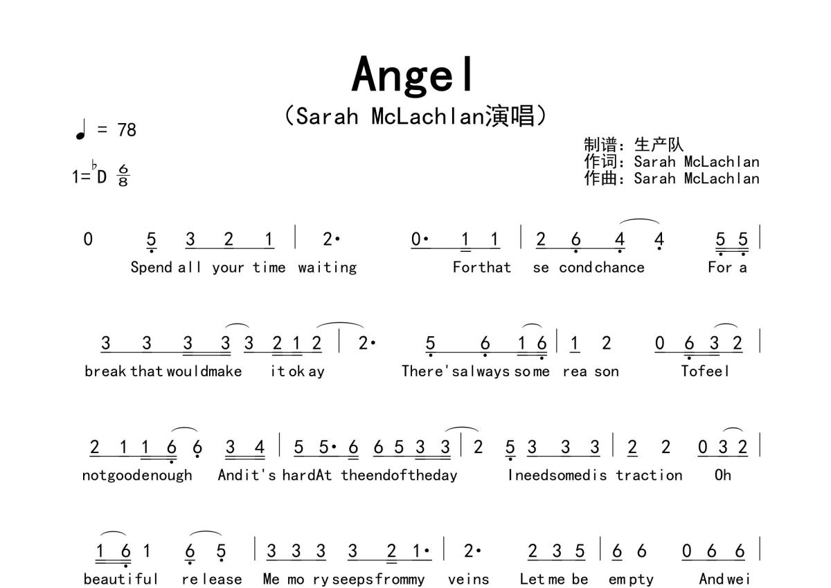 《Angel》是Sarah McLachlan演唱的一首歌曲,拍号为6/8拍,歌曲速度为每分钟78拍,这份简谱共有两张高清图谱,图谱由 @生产队 编配上传。