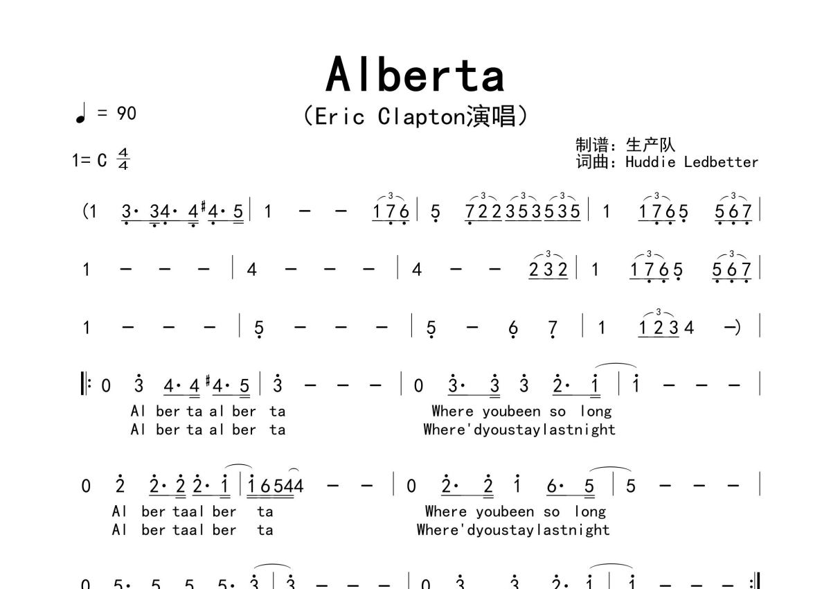 《Alberta》是Eric Clapton演唱的一首歌曲,拍号为4/4拍,歌曲速度为每分钟90拍,这份简谱共有一张高清图谱,图谱由 @生产队 编配上传。