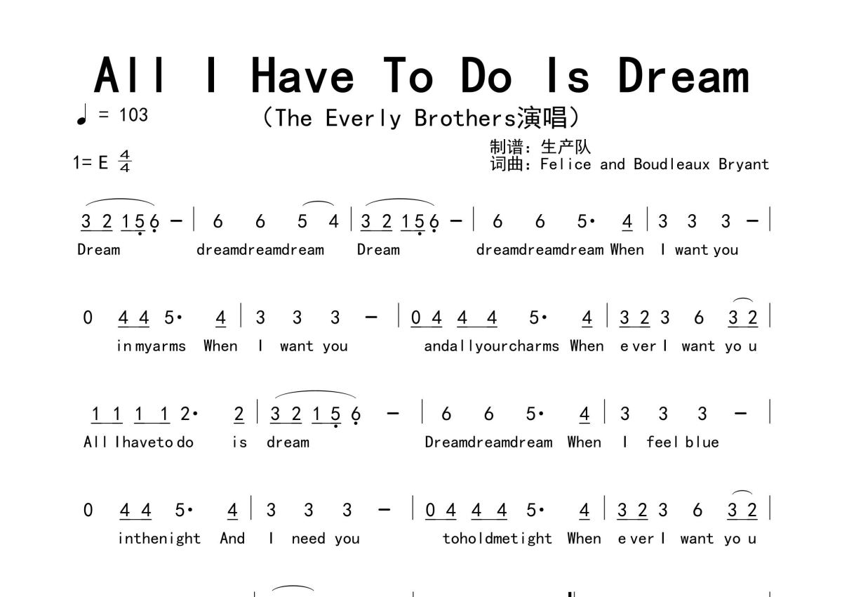 《All I Have To Do Is Dream》是The Everly Brothers演唱的一首歌曲,拍号为4/4拍,歌曲速度为每分钟103拍,这份简谱共有一张高清图谱,图谱由 @生产队 编配上传。