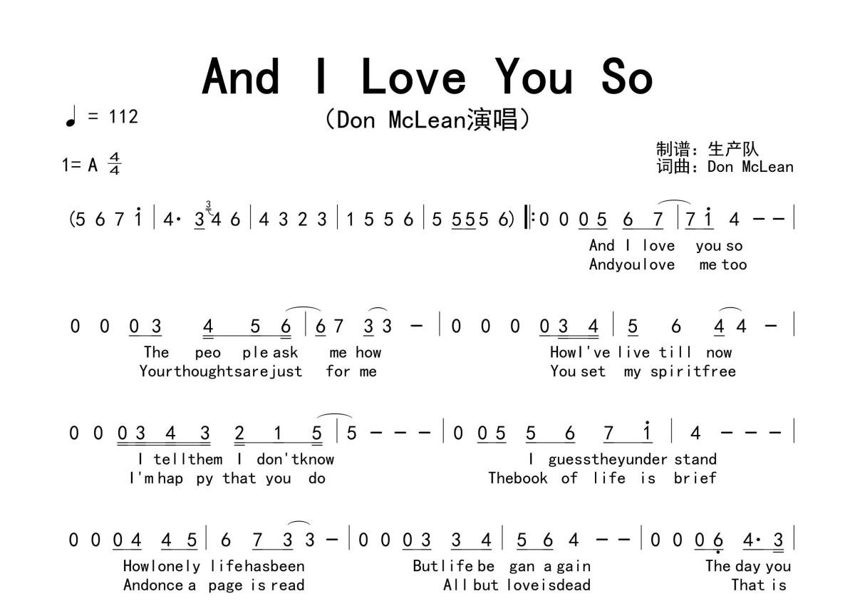 《And I Love You So》是Don Mclean演唱的一首歌曲,拍号为4/4拍,歌曲速度为每分钟112拍,这份简谱共有一张高清图谱,图谱由 @生产队 编配上传。