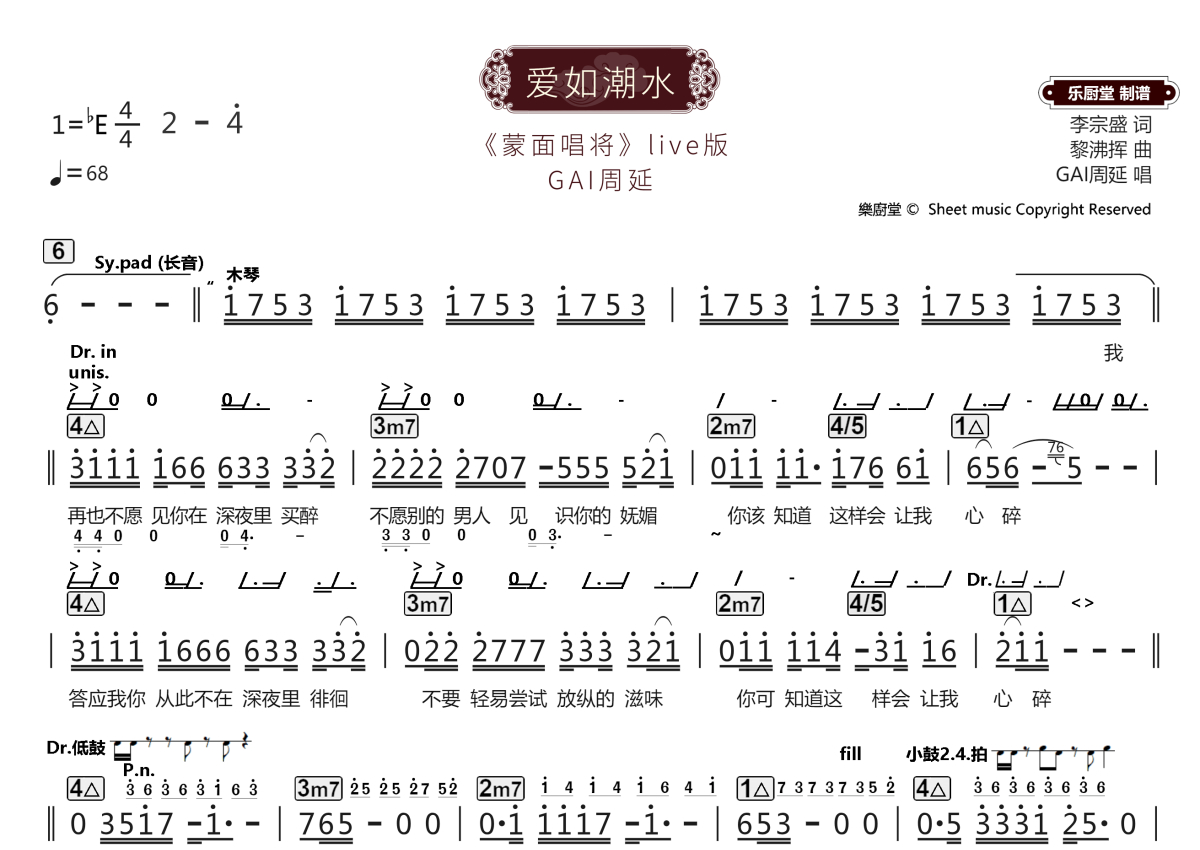 《爱如潮水(Live)》是Live演唱的一首歌曲,这份乐队总谱共有三张高清图谱,图谱由 @乐厨堂 编配上传。
