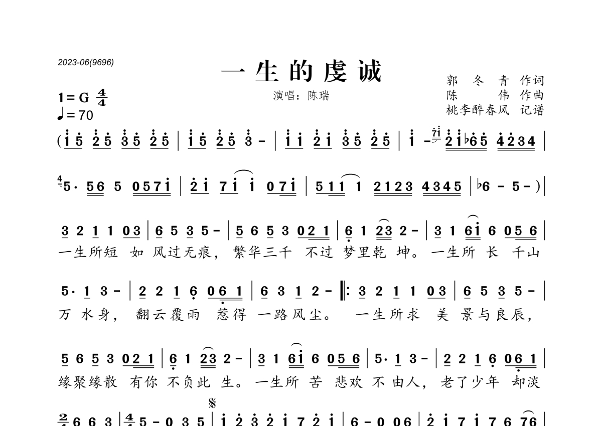 《一生的虔诚》是陈瑞演唱的一首歌曲,拍号为4/4拍,歌曲速度为每分钟70拍,这份简谱共有一张高清图谱,图谱由 @桃李醉春风 编配上传。