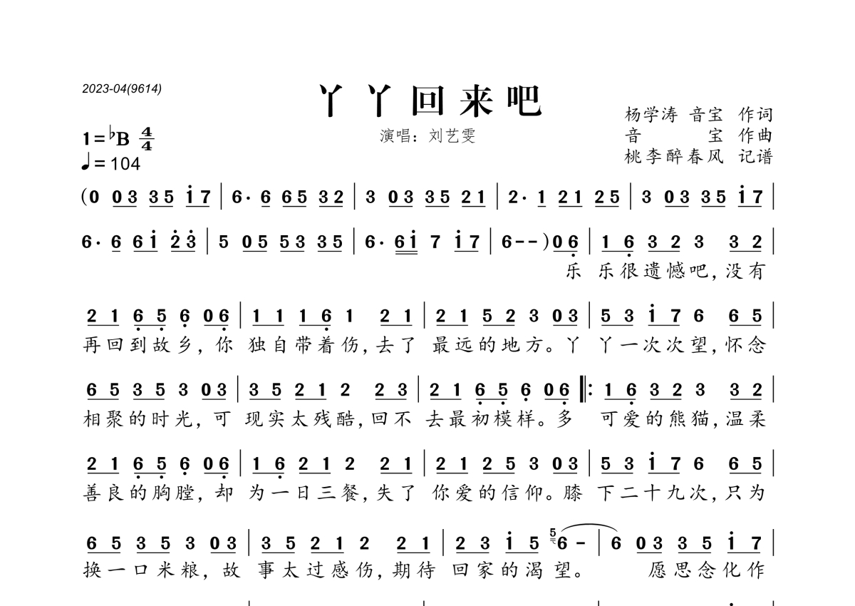 《丫丫回来吧》是刘艺雯演唱的一首歌曲,拍号为4/4拍,歌曲速度为每分钟104拍,这份简谱共有一张高清图谱,图谱由 @桃李醉春风 编配上传。