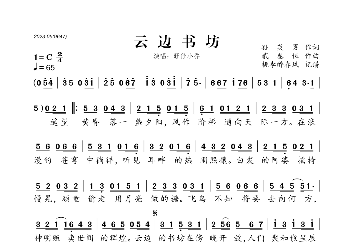 《云边书坊》是旺仔小乔演唱的一首歌曲,拍号为2/4拍,歌曲速度为每分钟65拍,这份简谱共有一张高清图谱,图谱由 @桃李醉春风 编配上传。