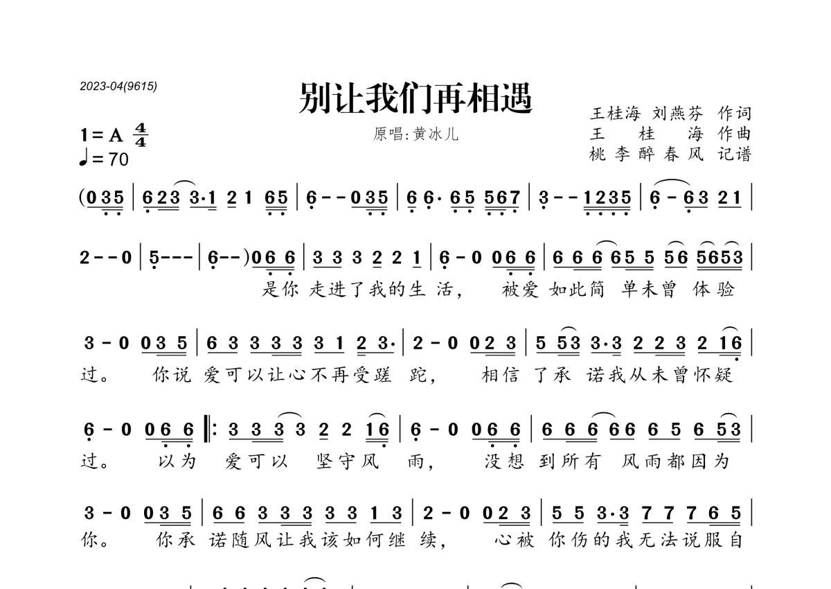 《别让我们再相遇》是黄冰儿演唱的一首歌曲,拍号为4/4拍,歌曲速度为每分钟70拍,这份简谱共有一张高清图谱,图谱由 @桃李醉春风 编配上传。