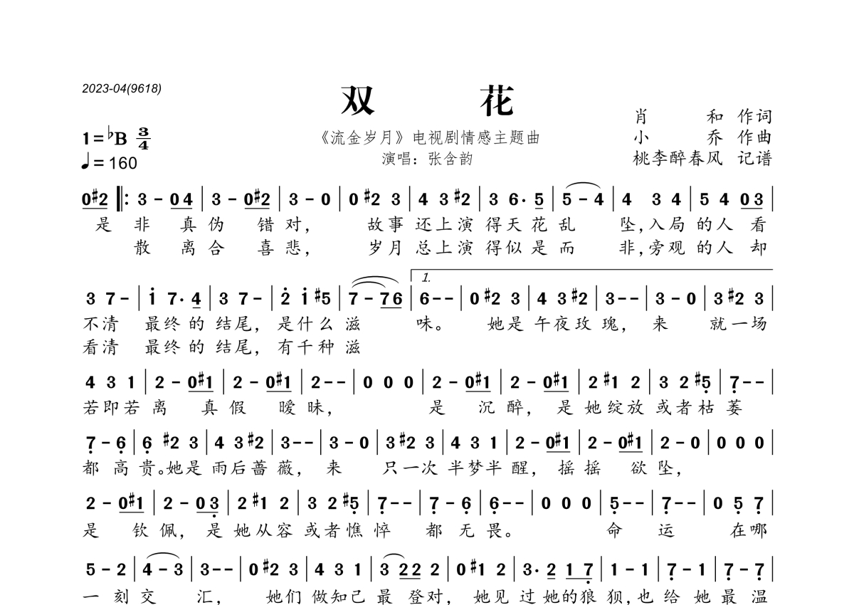 《双花》是张含韵演唱的一首歌曲,拍号为3/4拍,歌曲速度为每分钟160拍,这份简谱共有一张高清图谱,图谱由 @桃李醉春风 编配上传。