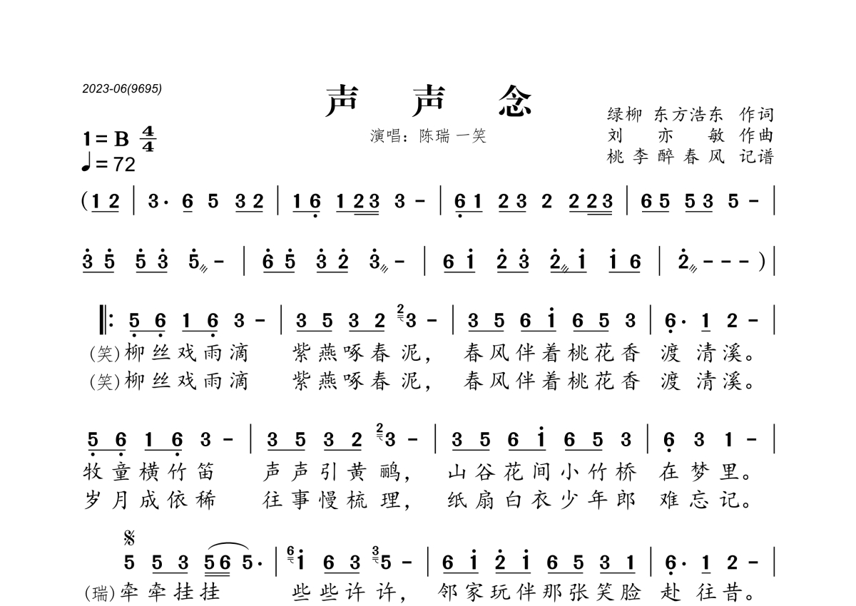 《声声念》是陈瑞&一笑演唱的一首歌曲,拍号为4/4拍,歌曲速度为每分钟72拍,这份简谱共有一张高清图谱,图谱由 @桃李醉春风 编配上传。