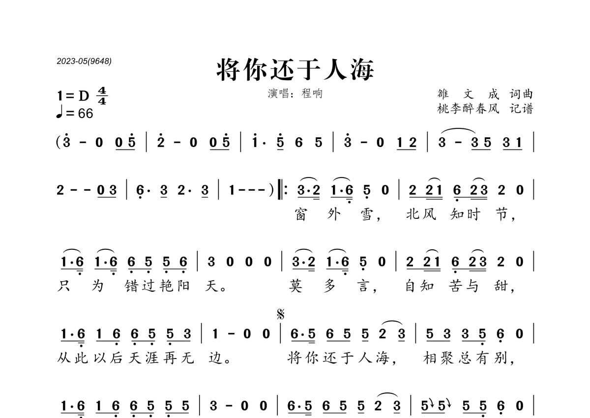 《将你还于人海》是程响演唱的一首歌曲,拍号为4/4拍,歌曲速度为每分钟66拍,这份简谱共有一张高清图谱,图谱由 @桃李醉春风 编配上传。