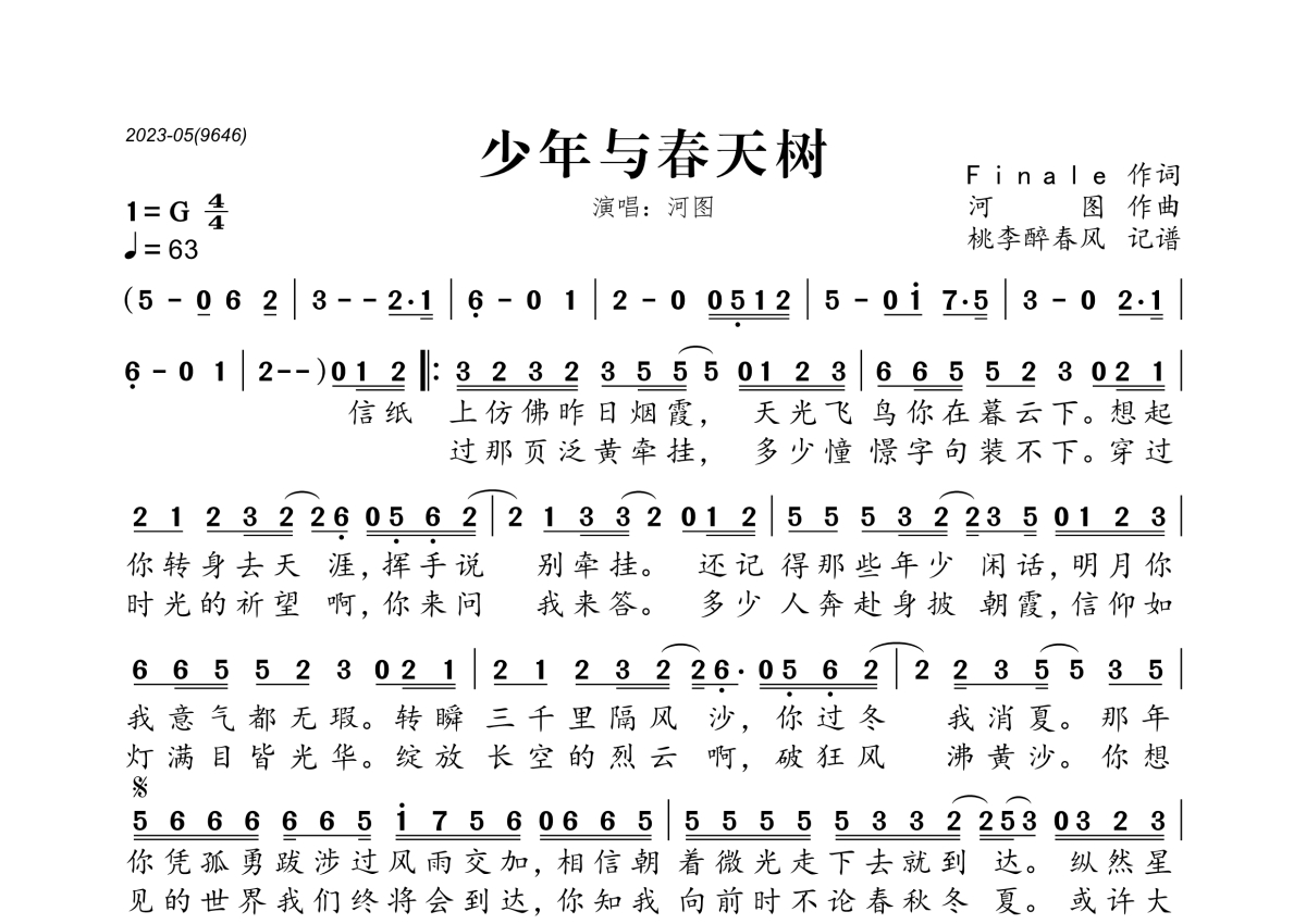 《少年与春天树》是河图演唱的一首歌曲,拍号为4/4拍,歌曲速度为每分钟63拍,这份简谱共有一张高清图谱,图谱由 @桃李醉春风 编配上传。
