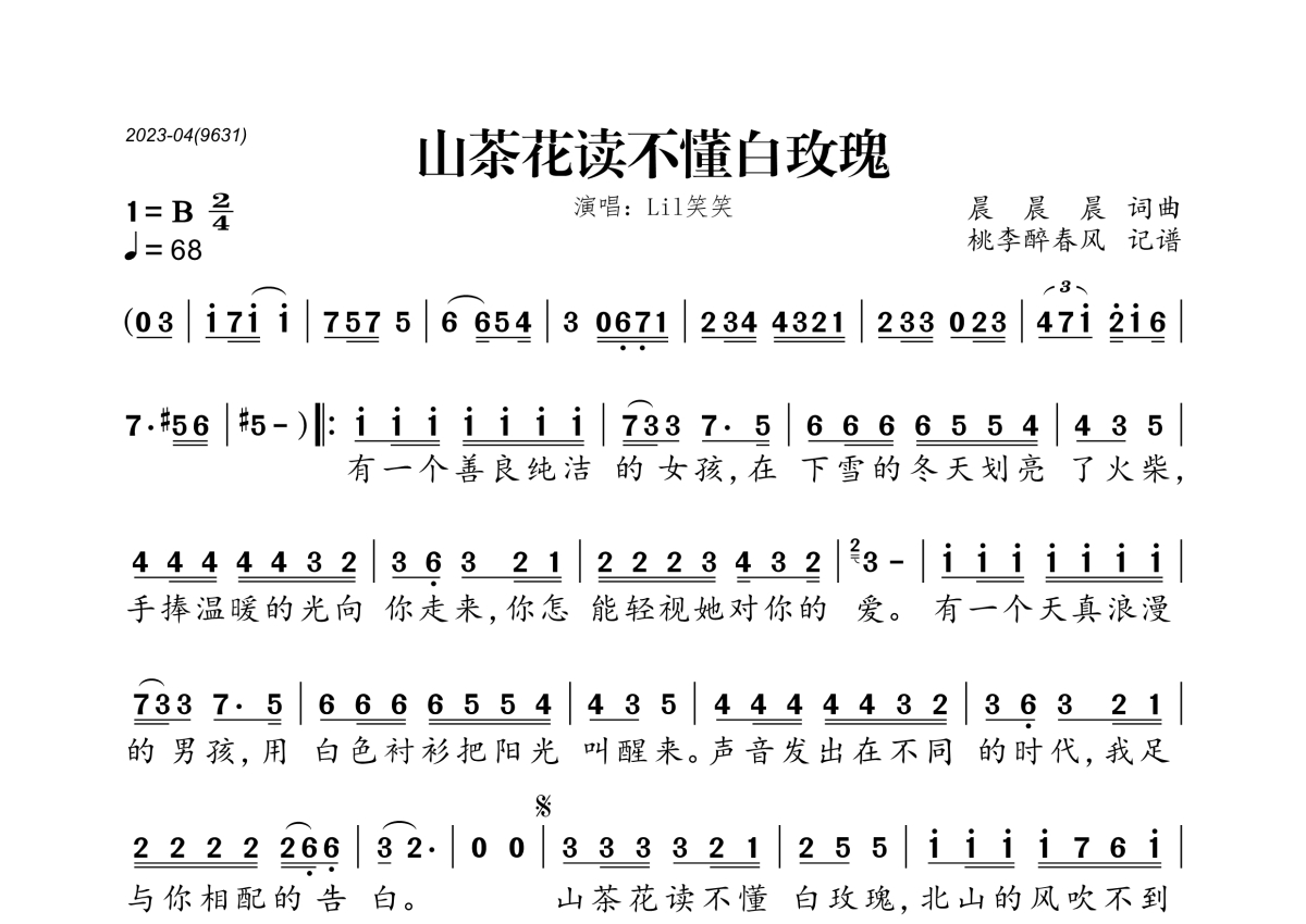 《山茶花读不懂白玫瑰》是LIi笑笑演唱的一首歌曲,拍号为2/4拍,歌曲速度为每分钟68拍,这份简谱共有一张高清图谱,图谱由 @桃李醉春风 编配上传。