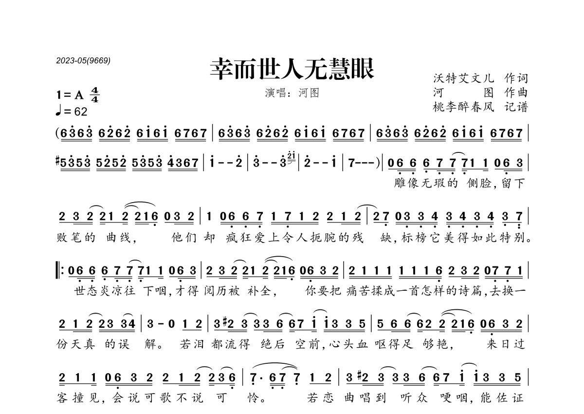 《幸而世人无慧眼》是河图演唱的一首歌曲,拍号为4/4拍,歌曲速度为每分钟62拍,这份简谱共有一张高清图谱,图谱由 @桃李醉春风 编配上传。